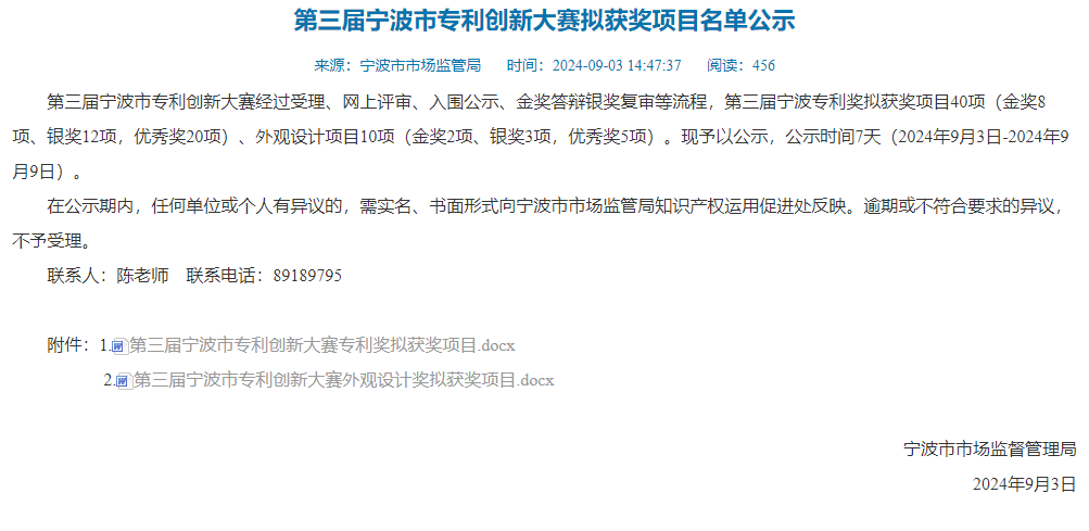 喜訊 | 我院一項(xiàng)專利發(fā)明榮獲第三屆寧波市專利創(chuàng)新大賽專利優(yōu)秀獎(jiǎng)發(fā)布日期:2024.09.18