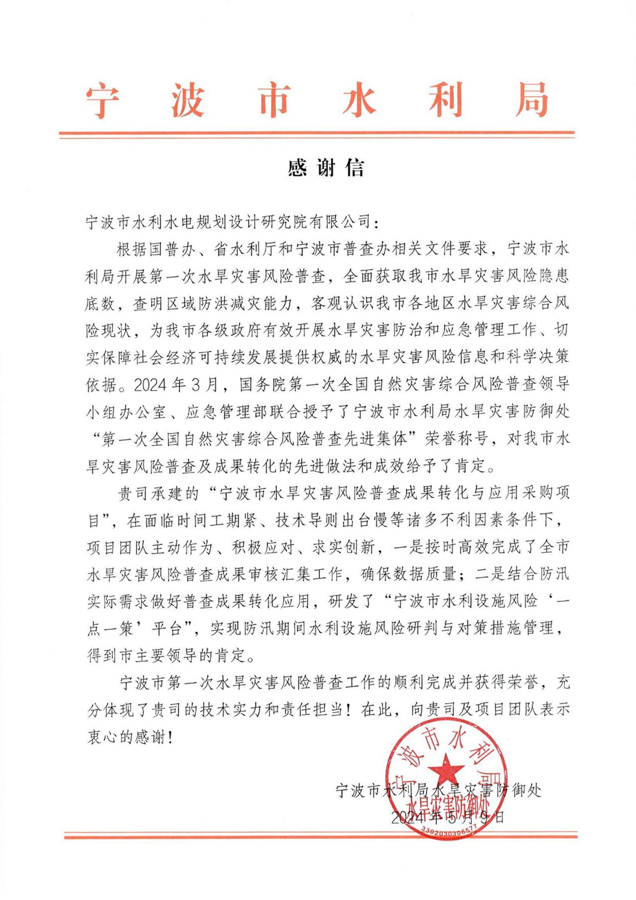 為寧波市水利院點贊——一封來自寧波市水利局水旱災害防御處的感謝信發(fā)布日期:2024.05.15