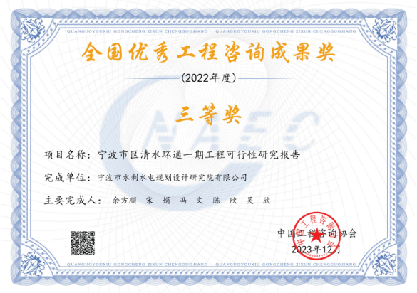 在工程項目方面,獲得2022年度全國優(yōu)秀工程咨詢成果獎、2024年度寧波市優(yōu)秀勘察設(shè)計獎、2024年浙江省勘察設(shè)計行業(yè)優(yōu)秀勘察設(shè)計”綜合類成果獎、寧波市優(yōu)秀水利工程設(shè)計二等獎、“浙江省文明標(biāo)化工地”稱號、“2024年度寧波軌道交通市域鐵路工程立功競賽先進集體”等各類獎項十余項。