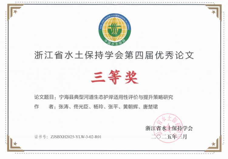 會議現(xiàn)場通報了2024年度生產(chǎn)建設(shè)項目水土保持方案優(yōu)秀單位、2024年度生產(chǎn)建設(shè)項目水土保持監(jiān)測優(yōu)秀單位,并為獲獎集體進(jìn)行表彰。隨后,又現(xiàn)場表彰了浙江省水土保持學(xué)會第四屆優(yōu)秀論文評選結(jié)果。我院榮獲2024年度生產(chǎn)建設(shè)項目水土保持方案優(yōu)秀單位、2024年度生產(chǎn)建設(shè)項目水土保持監(jiān)測優(yōu)秀單位兩項集體榮譽,并且以論文《寧??h典型河道生態(tài)護(hù)岸適用性評價與提升策略研究》獲得浙江省水土保持學(xué)會第四屆優(yōu)秀論文三等獎。
