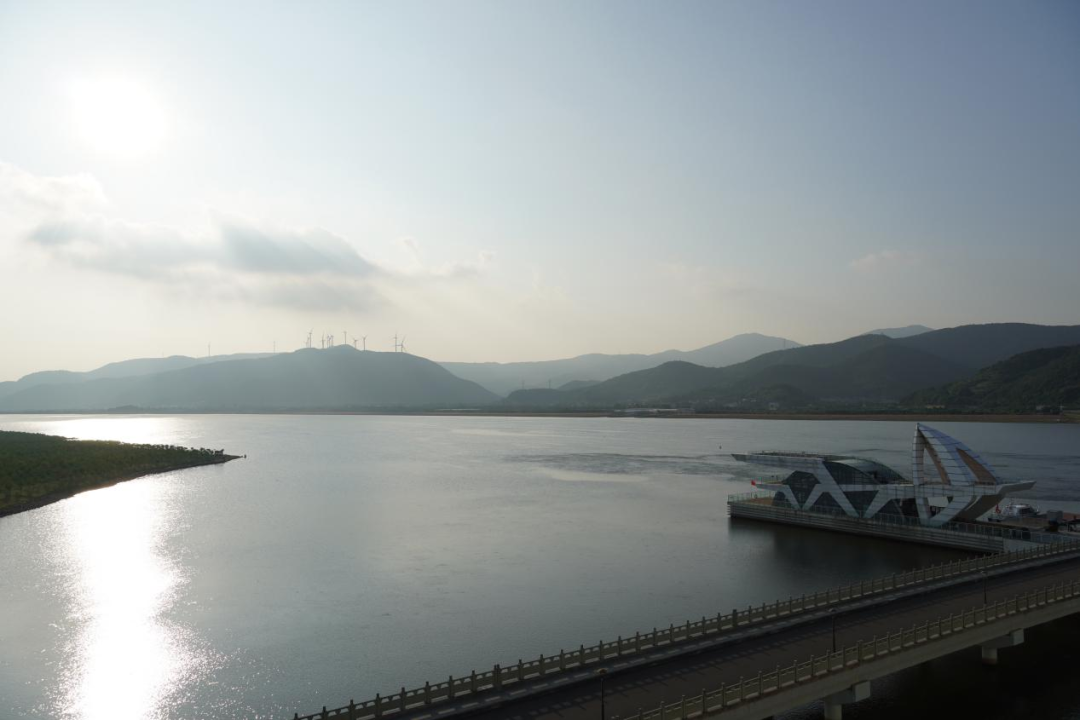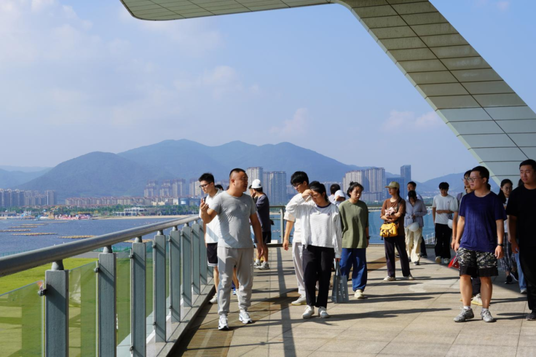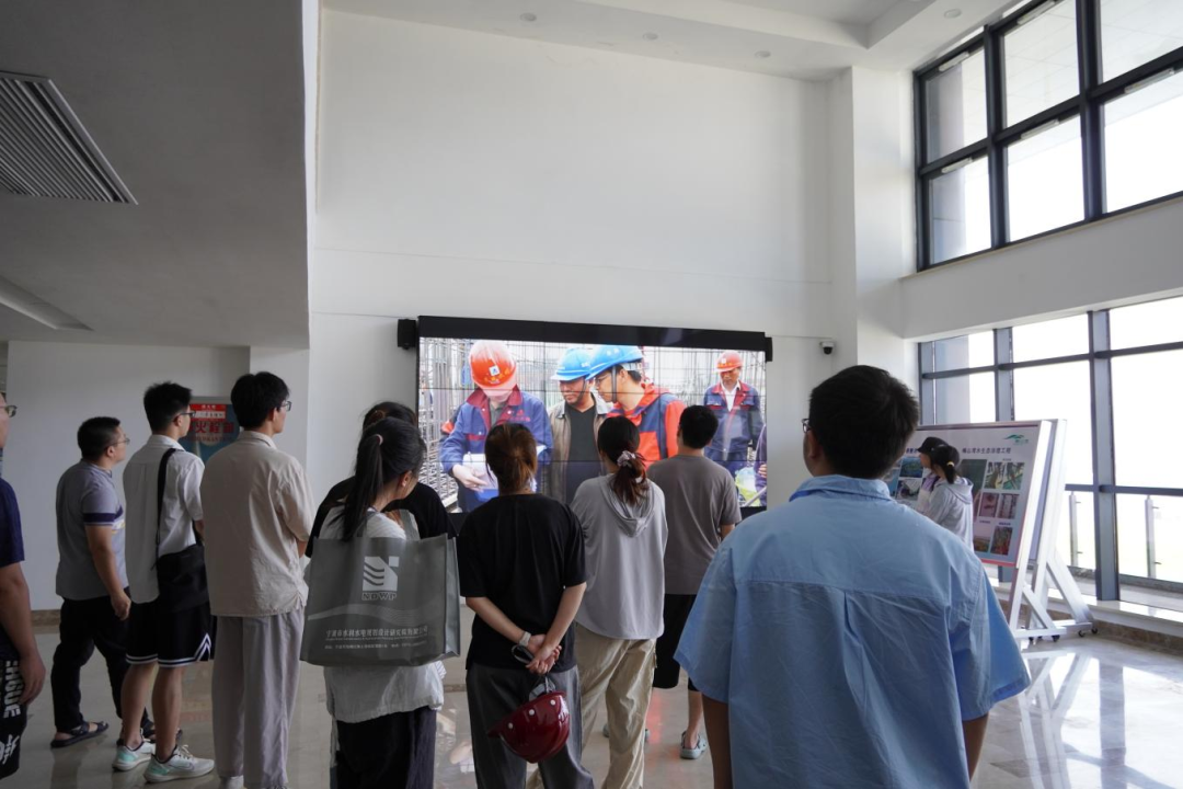梅山灣外,銀浪拍岸;梅山灣內(nèi),碧波含翠。首先,研學(xué)隊(duì)伍到達(dá)梅山灣建設(shè)管理中心,跟隨工作人員登樓參觀(guān),眺望南堤樞紐及附近設(shè)施,聆聽(tīng)工程總體建設(shè)情況,并觀(guān)看宣傳片,了解該工程的誕生始末。