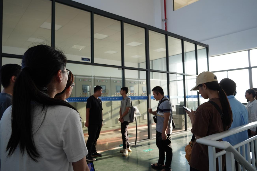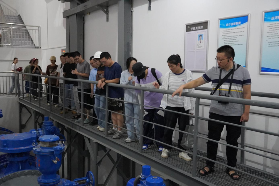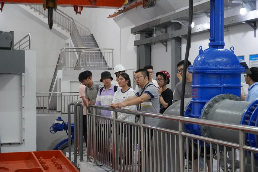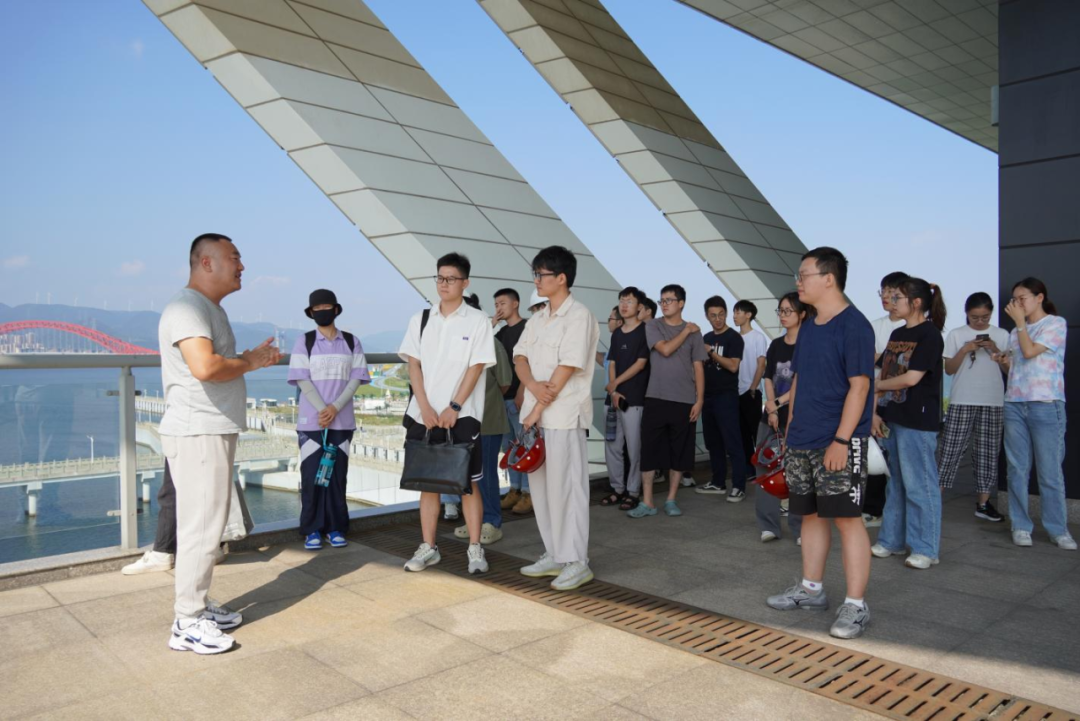 最后,研學(xué)隊(duì)伍來(lái)到北堤樞紐參觀(guān)。該工程榮獲中國(guó)建筑行業(yè)工程質(zhì)量的最高榮譽(yù)獎(jiǎng)——2020-2021年度第一批中國(guó)建設(shè)工程魯班獎(jiǎng)。胡經(jīng)理帶領(lǐng)研學(xué)隊(duì)伍依次進(jìn)入啟閉機(jī)房、觀(guān)景臺(tái)、控制室等處,現(xiàn)場(chǎng)講解工程設(shè)計(jì)思路、建造工藝和管理要點(diǎn)。
