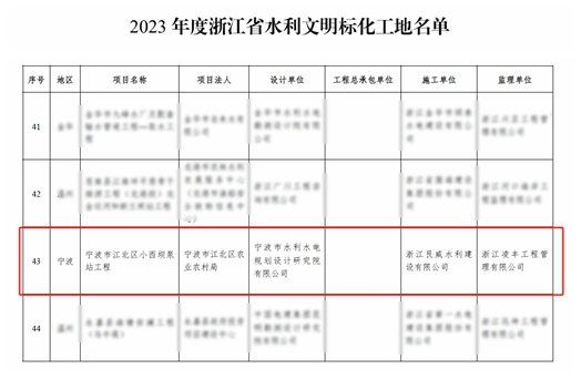 近日,經(jīng)浙江省水利廳2023年度浙江省水利文明標(biāo)化工地名單公布,我院承擔(dān)全過程工程咨詢的寧波市江北區(qū)小西壩泵站工程喜獲“浙江省文明標(biāo)化工地”稱號,成為寧波市水利行業(yè)的標(biāo)桿工程。