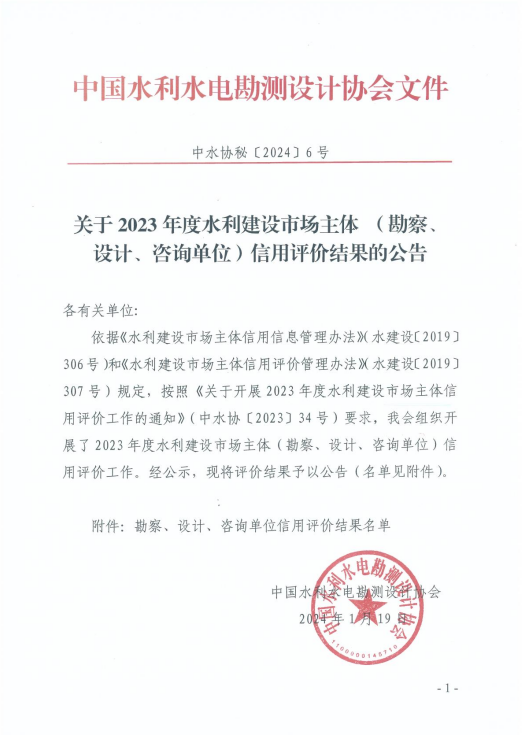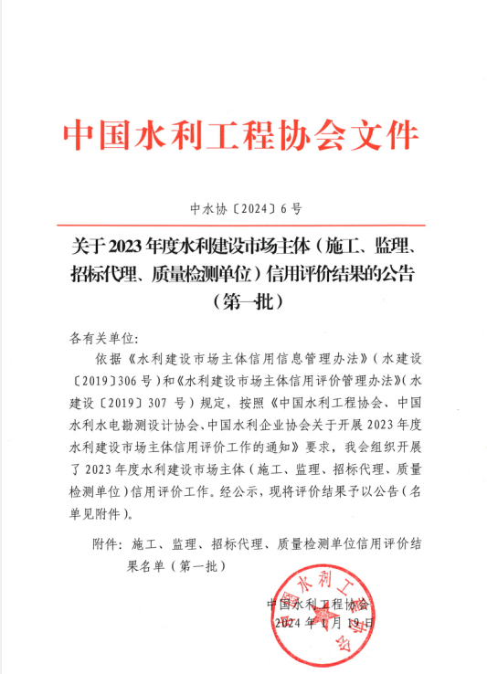 近日,中國水利工程協(xié)會《關于2023年度水利建設市場主體(施工、監(jiān)理、招標代理、質(zhì)量檢測單位)信用評價結果的公告(第一批)》(中水協(xié)〔2024〕6號)、中國水利水電勘測設計協(xié)會《關于2023年度水利建設市場主體(勘察、設計、咨詢單位)信用評價結果的公告》(中水協(xié)秘〔2024〕6號)、《關于2023年度全國水利水電勘測設計行業(yè)信用評價結果的公告》(中水協(xié)秘〔2024〕7號)發(fā)布。