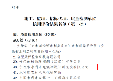 今年,寧波市水利院繼信息化業(yè)務企業(yè)信用獲評AAA最高等級后,再創(chuàng)佳績,勘察、設計、咨詢、質(zhì)量檢測4項業(yè)務獲評AAA級,水資源論證,水文、水資源調(diào)查評價,水土保持方案編制3項獲評AAA+級,均為最高等級。其中,水文、水資源調(diào)查評價,質(zhì)量檢測兩項為首次參評。