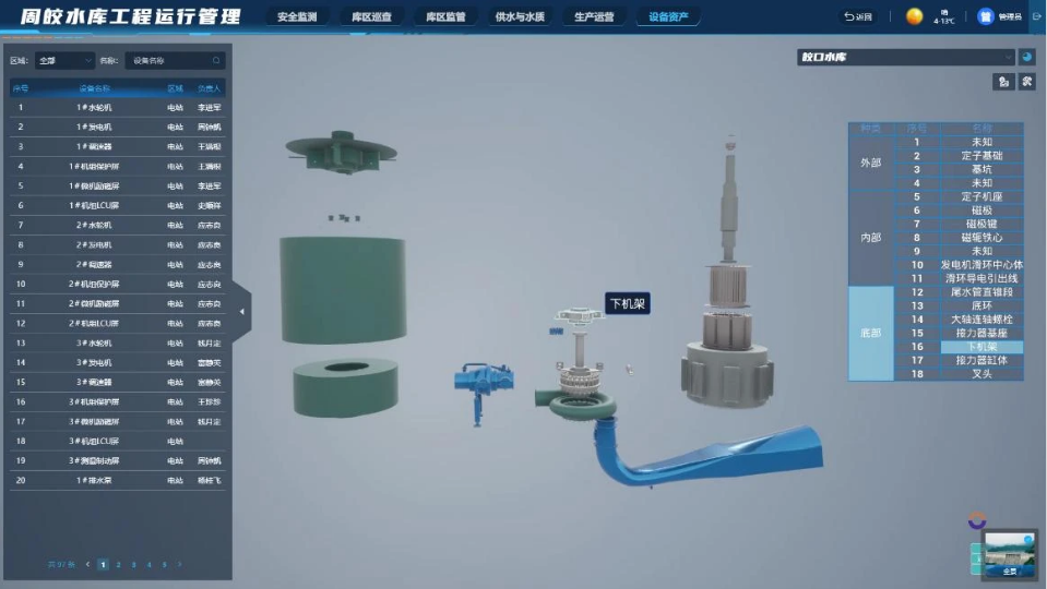 依托BIM仿真建模技術(shù),數(shù)字孿生周公宅-皎口梯級水庫系統(tǒng)實現(xiàn)了對水庫重要設(shè)備資產(chǎn)的精細(xì)管理。結(jié)合監(jiān)測監(jiān)控數(shù)據(jù),實時掌握水庫防洪、供水、發(fā)電的運行狀況,保障水庫安全高效運行。同時,利用BIM技術(shù)對水輪機、發(fā)電機等重要機電設(shè)備進(jìn)行零部件級的拆解,“再現(xiàn)”設(shè)備的內(nèi)部機構(gòu)和狀態(tài)。這一技術(shù)幫助水庫工作人員直觀、深入地了解設(shè)備的運行原理與機制,為設(shè)備的精細(xì)管理及維修養(yǎng)護(hù)提供重要支持,也大幅提升了水庫設(shè)備管理的智能化水平。