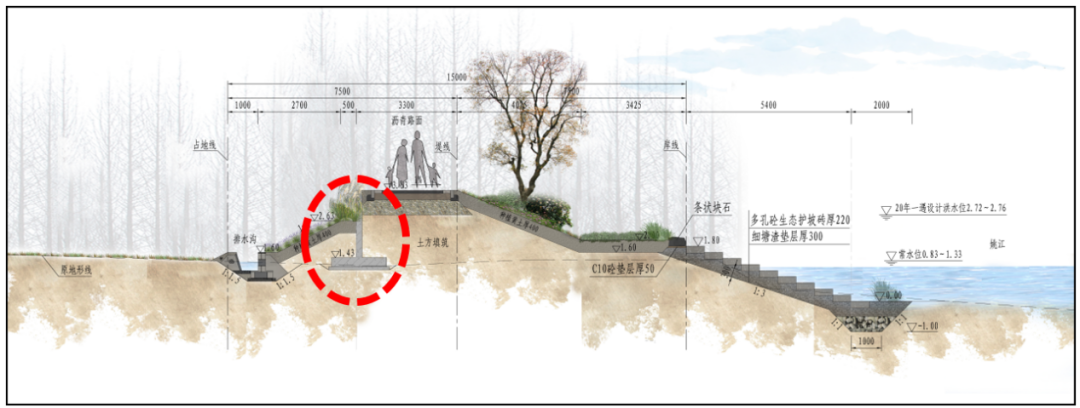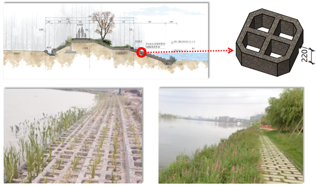 為了保證水體交換同時(shí)防御土體掏刷,工程迎水側(cè)護(hù)坡采用多孔混凝土生態(tài)護(hù)坡磚,不僅防沖固土,也利于水生動植物生長,營造自然、生態(tài)的水岸環(huán)境。